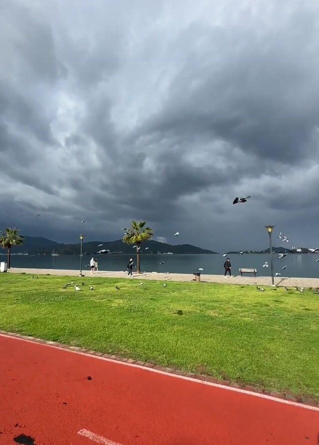 A vertical video shows an outdoor scene of a waterfront park with a red running track. The sky is overcast with dark, stormy clouds. A man and a young child walk along the red track, holding hands. A strip of green grass separates the track from the water. Palm trees and street lamps are spaced along the grassy area. Several people are walking along the waterfront. Many birds, mostly seagulls, fly around and perch on the grass. In the background, across the water, are landmasses with hills. The camera appears to be following the walking man and child, keeping them in the frame, and allowing the viewer to observe the scene as they move forward. The shadow of the person holding the camera is visible on the track in the foreground.