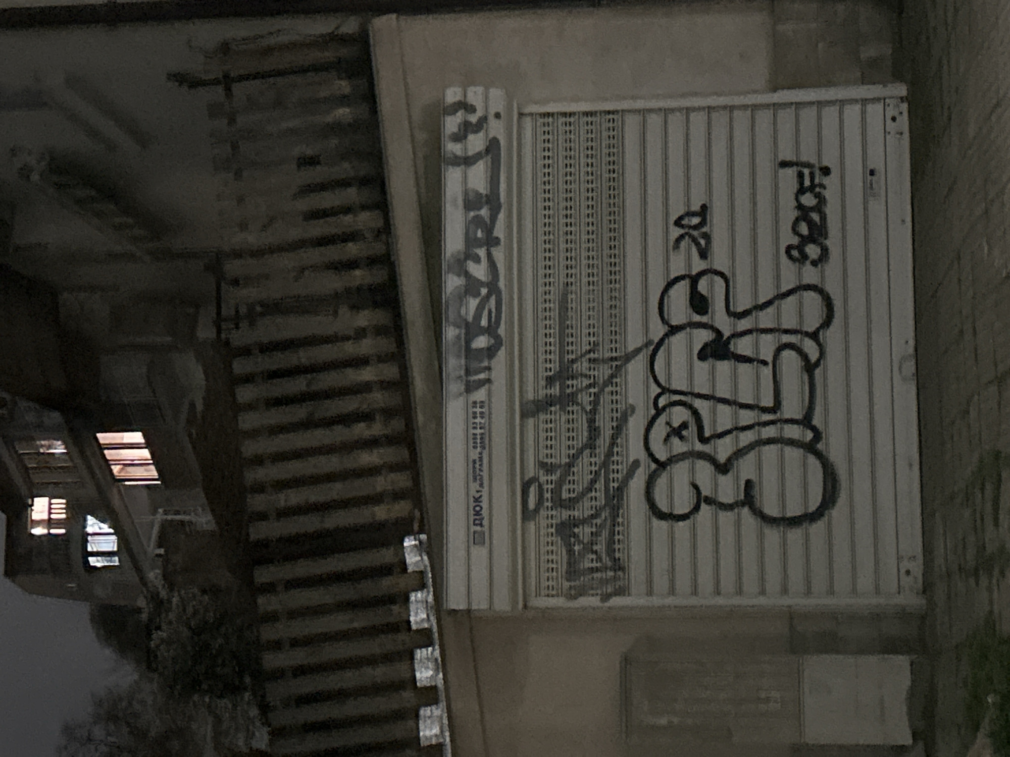 A photograph shows a building facade in Plovdiv, Bulgaria, at night. A corrugated metal security shutter covers a storefront. The shutter is covered in black graffiti, including stylized lettering, numbers, and abstract designs. To the left of the shutter, more graffiti is visible on the adjacent surface. In the background, a building with lit windows is visible. A metal structure is partially visible on the left. Vegetation is present near the base of the building on the right. The lighting is dim, suggesting either early morning or late evening.