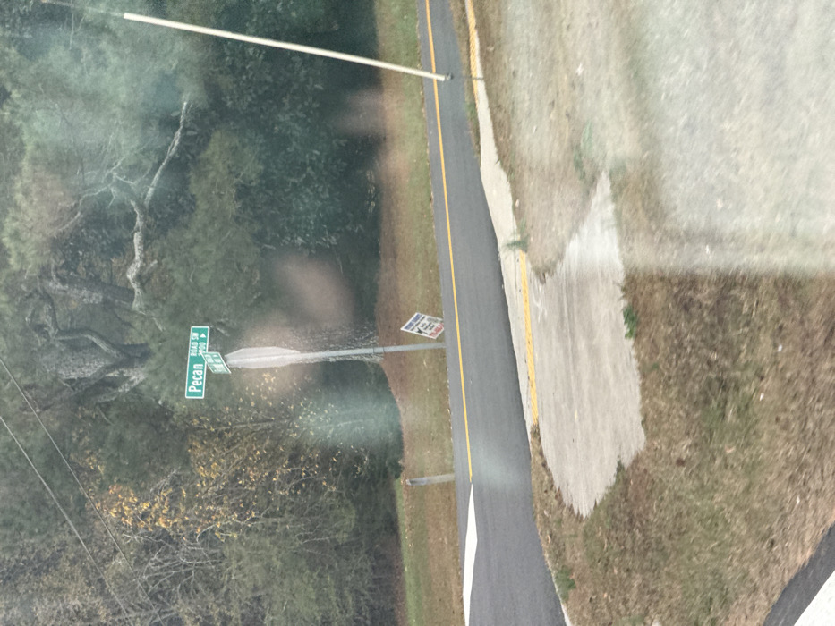 A roadside scene shows a green "Pecan" street sign with an arrow pointing towards "Road SW 900". Further down the road, a speed limit sign stands next to the pavement. A two-lane road with a yellow line divider runs along the right side of the image, flanked by a grassy area. Trees and foliage occupy the left side of the road. The photo appears to be taken from inside a vehicle.