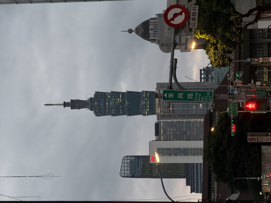 The image presents an urban twilight scene in Taipei, Taiwan. The prominent structure is the Taipei 101 skyscraper, centrally located, with its distinctive tiered design and spire, featuring illuminated windows against an overcast sky. To the left, the W Taipei hotel is visible, identified by a red 'W' logo on its facade. To the right, another building with a dark, domed roof is partially visible. In the foreground, street infrastructure includes a vertical green street sign indicating "東興路 Dong Xing Rd." with numerical references "33, 27, 26". A traffic light pole displays a red illuminated pedestrian signal depicting a standing figure, and vehicle traffic lights, one appearing green and another red. A circular red and white traffic sign with a diagonal line across a right-turn arrow signifies "No Right Turn," accompanied by the text "公車除外" (Buses Excepted). Overhead, streetlights are illuminated, and utility wires are visible in the upper left. Green foliage from trees occupies the lower portions of the frame. No discernible individuals or explicit actions are present. The location is identified as being near Dong Xing Road in Taipei, providing a view of the Taipei 101 and W Taipei buildings, characteristic of the Xinyi District or an adjacent area like Songshan District.