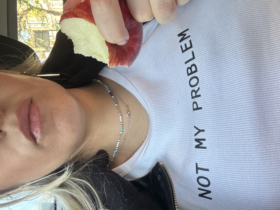 close-up view of a young woman, likely in her late teens or early twenties, wearing a white t-shirt with the words "NOT MY PROBLEM" printed on the front. She is wearing a black leather jacket over the t-shirt and has a silver earring in her right ear. She is holding a red apple in her right hand, taking a bite from it. Her lips are painted with pink lipstick. The image was taken in Liverpool, United Kingdom, at the coordinates 53.4° N, 2.926° W. The background is blurred, but appears to be a city street. The woman is in a relaxed posture and seems to be enjoying the apple. The lighting is good and the image is in focus. The overall tone of the image is casual and unassuming.