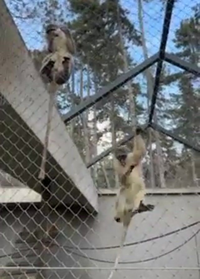 group of monkeys in an outdoor enclosure made of wire mesh. The monkeys are seen climbing and swinging on the mesh walls, as well as on wooden structures within the enclosure. There are trees visible in the background, and a sign is posted on the enclosure.