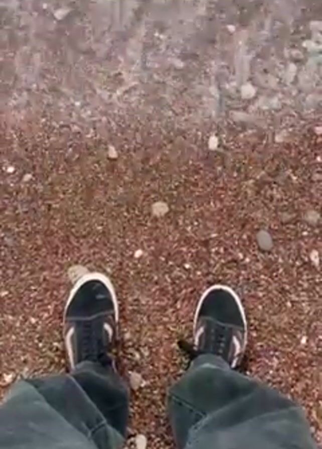 A person stands on a pebble beach, looking down at their feet. The person is wearing black sneakers with white trim and faded gray-green pants. The beach is covered in small, reddish-brown pebbles and some larger, scattered white stones. Gentle waves wash over the pebbles, briefly covering the area around the person’s shoes. The video is shot from a first-person perspective.