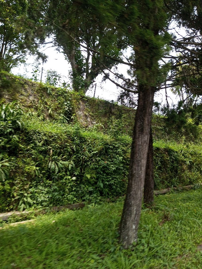 The image captures an outdoor scene in Vieng Phouka, Laos, dominated by lush green vegetation. In the foreground, green grass appears horizontally blurred, suggesting motion. Two dark-barked tree trunks, also exhibiting slight blur, rise vertically on the right side of the frame. Behind the foreground, a stone or concrete retaining wall is extensively covered with dense, varied green foliage, including ferns and other small plants. Above and behind the wall, the canopies of several tall trees, with some leaves showing motion blur, extend upwards against a bright, overcast sky. Thin, light-colored posts are visible along the top edge of the retaining wall, interspersed within the vegetation. No human figures or direct interactions are present.