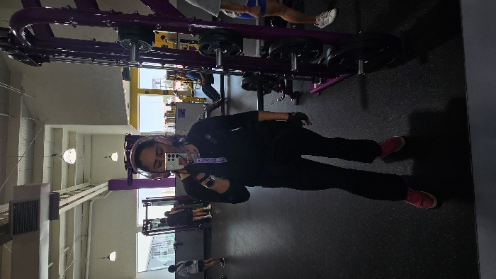 A person in black clothing and red shoes takes a selfie in a gym. Overhead weight machines are visible. The person is wearing headphones. Other people are in the background working out, as well as fitness equipment. Fluorescent lighting is visible on the ceiling.