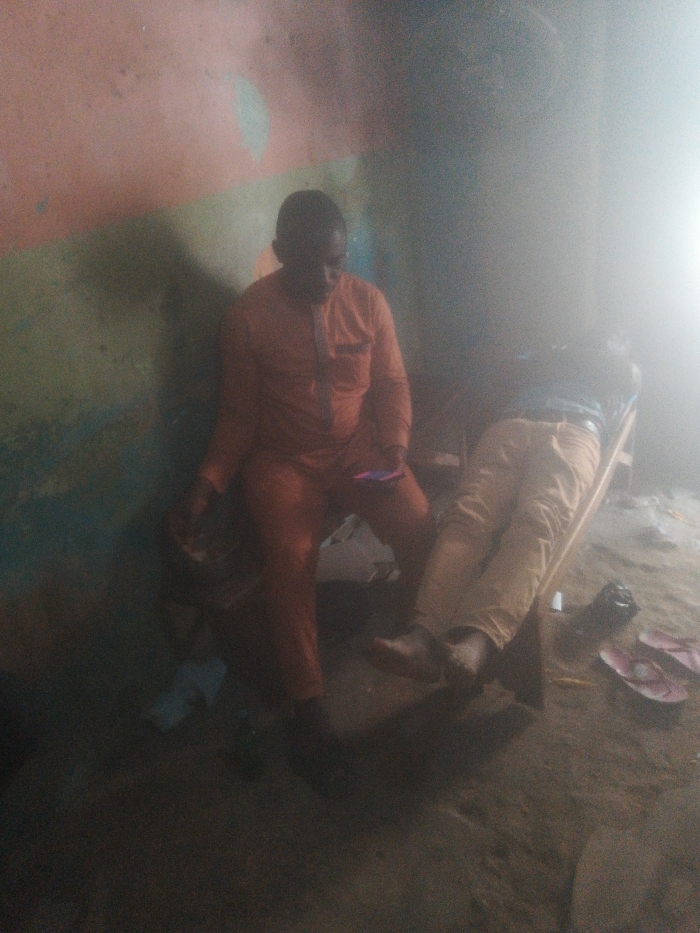 The image displays an interior scene in Zaria, Nigeria, characterized by dim, hazy lighting and an uneven dirt floor littered with debris. The walls are roughly plastered and painted in faded, patchy shades of orange, green, and possibly blue. Two individuals are present. On the left, an adult male wearing an orange long-sleeved tunic and matching trousers sits on a low wooden bench. His head is tilted downward, and he is observed holding a small, illuminated object, consistent with a mobile phone, in his left hand. His bare feet rest on the dirt floor, adjacent to a white plastic bottle. To the right, a second individual lies supine on a wooden bed frame or cot. This person is dressed in a dark top and light-colored (tan or beige) trousers. Their bare feet are visible at the lower right of the frame, positioned near two pink flip-flops lying on the dirt floor. A strong, localized light source from the right side of the image creates significant overexposure and haze, obscuring specific details in that quadrant. No direct interaction is evident between the two individuals.