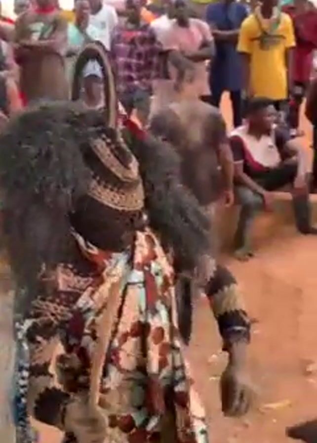 The video depicts a scene in what appears to be an outdoor gathering or celebration. The central figure is adorned in a traditional costume that includes a black, fringed mask or headdress, a patterned cloth wrap, and holds wooden sticks or implements. This individual is surrounded by a crowd of onlookers of various ages and clothing styles. The background reveals a dirt or sandy ground, and some trees, suggesting the location is possibly a village or community area. The camera moves, capturing the performer’s actions and the reactions of the people watching. The overall atmosphere seems festive and communal.