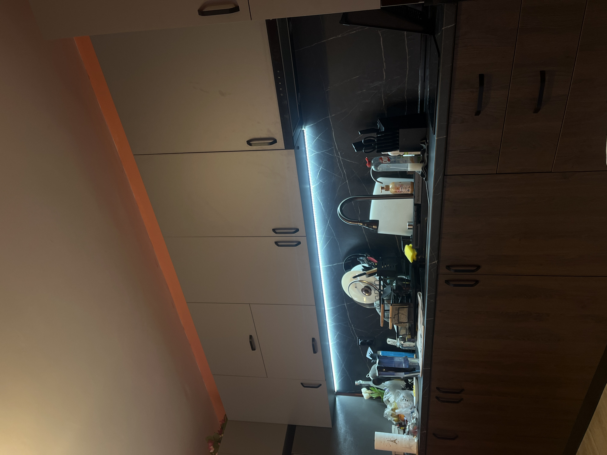 A static, eye-level interior view depicts a modern kitchen in Ravno Pole, Bulgaria. The upper section features a light-colored ceiling with an orange-colored trim, below which are grey-colored upper cabinets with black horizontal bar handles. An integrated black extractor hood is visible beneath the central upper cabinet. A continuous strip of blue-white LED lighting illuminates the dark grey or black backsplash, which exhibits prominent white veining. The countertop, matching the dark aesthetic of the backsplash, extends across the scene. On the countertop, from left to right: a white decorative object resembling the Eiffel Tower, a white plastic bag containing miscellaneous items, a white plate with residue, a blue water filter pitcher, a stainless steel kitchen faucet over a dark sink basin, a white dish drying rack with plates and cutlery, a bottle of dish soap (Puf brand), a black knife block with knives, a yellow sponge, and a dark mat. To the far right, a dark induction or ceramic cooktop is partially visible, along with a tall, slim black object. The lower section consists of dark brown wooden cabinets with matching black horizontal bar handles, including both hinged doors and drawers. No individuals are present in the scene, and no actions or interactions are depicted.