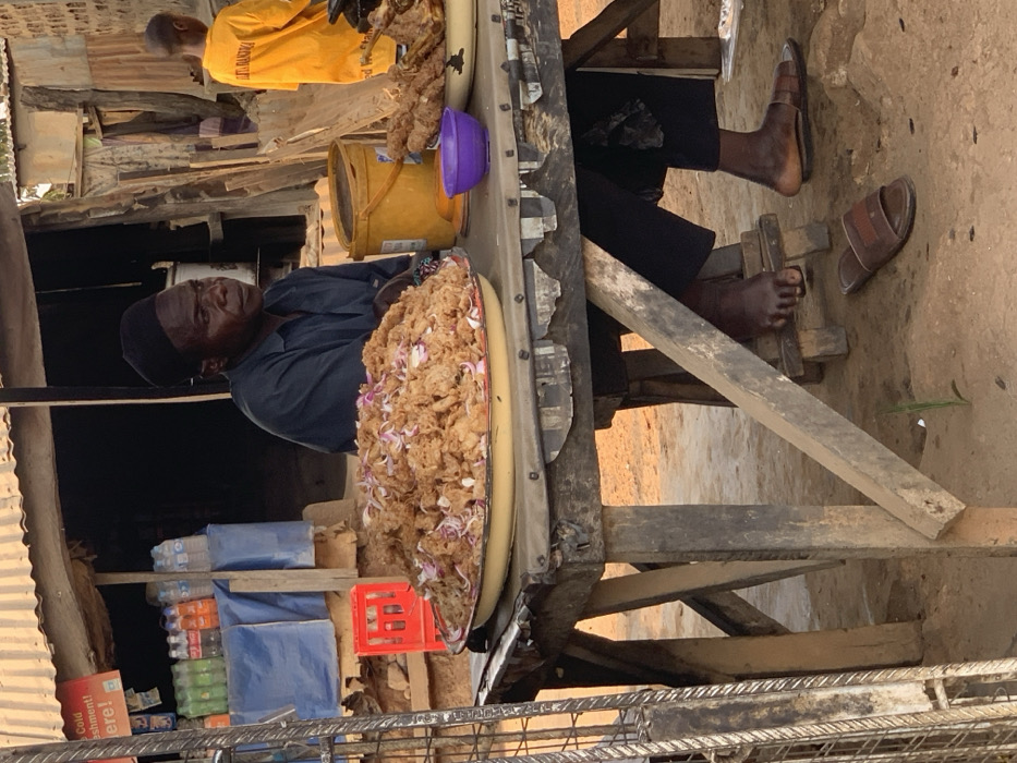A man sits behind a table laden with a large platter of fried food mixed with sliced onions. He is wearing a dark-colored garment and a hat. A bucket and a purple container sit nearby. Behind him is a makeshift shelter with stacked water bottles. Another person, wearing a yellow shirt, is to the right. The man's sandals are off to the side, and he rests his feet on the structure of the table.