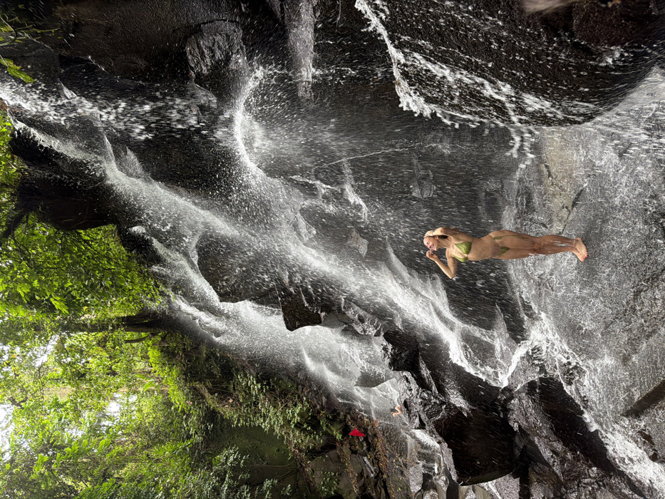 A blonde woman in a green bikini stands behind a powerful waterfall