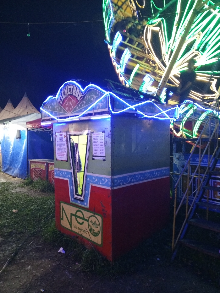 A ticket booth illuminated with blue lights stands prominently, reading "TICKET BOX" above. It's painted with red and green accents, featuring "NEO Management" on its lower panel. Adjacent is a partially visible Ferris wheel lit with green and yellow lights, with a figure standing on it. A set of stairs leading up to the Ferris wheel can be seen. Tents are visible in the background. The scene appears to be at a fair or carnival at night. The ground is covered with grass and dirt.