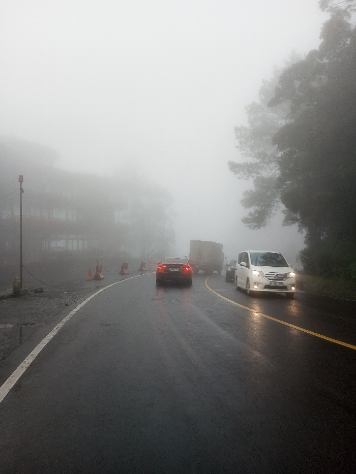 The image depicts a road scene in Dawathang_Dorjibi_ Kashingtsawa, Bhutan, characterized by heavy fog