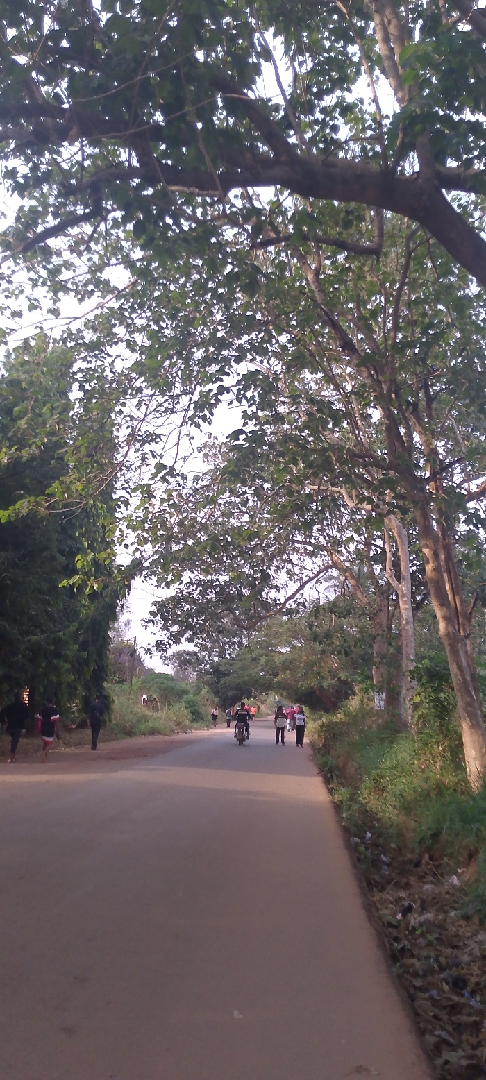 A low-angle shot captures a sunlit road flanked by trees. The road stretches into the distance, populated by people walking and a motorcyclist. Overhanging branches form a leafy canopy overhead, filtering the light. Litter lines the road's edge on the right side. The scene evokes a sense of community and everyday life in a natural setting.