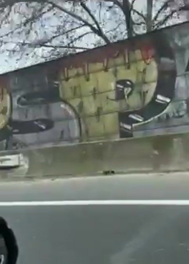 view from inside a car traveling on a highway. The camera is positioned behind the dashboard, facing forward. The outside environment, seen through the car window, includes a grey cloudy sky, and roadside elements. On the right of the road, there's a barrier with graffiti art. As the car moves, the view extends to show a bridge structure with bare trees and buildings in the background. The road surface is asphalt with white lane markings. The dashboard contains items such as a small pouch. The video continues with the car moving down the highway.