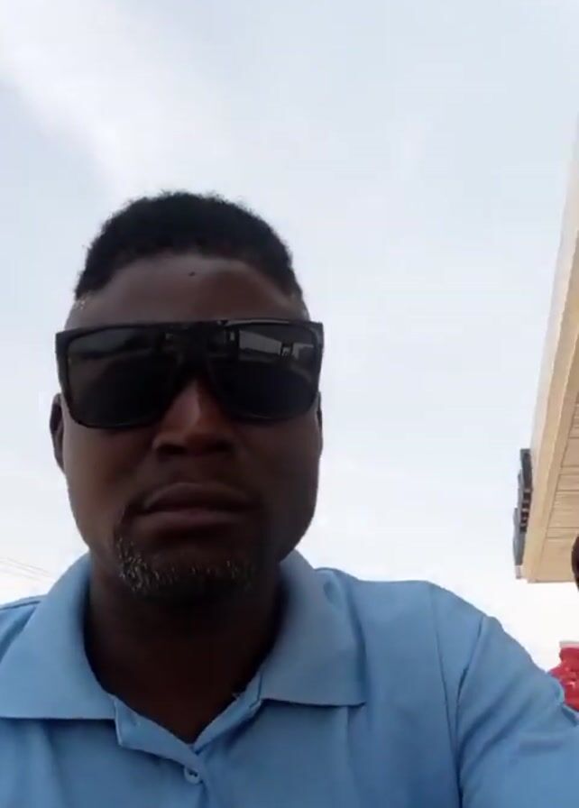 A man wearing a light blue polo shirt and black sunglasses is sitting on the back of a motorcycle. He is looking directly at the camera while the motorcycle appears to be in motion. The background reveals a street scene with buildings, power lines, and other vehicles. The sky is visible and mostly white.
