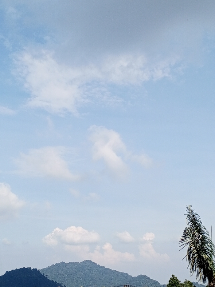 This image depicts a wide-angle outdoor landscape scene in Beipa, Liberia, under a partly cloudy sky. The upper two-thirds of the frame are dominated by a pale blue sky featuring scattered white cumulus clouds of varying sizes and densities. The lower third of the image reveals a distant range of tree-covered mountains or hills, characterized by dense green foliage. A prominent section of a tropical tree, likely a palm, with dark green fronds, is visible on the far right edge of the frame, extending upwards into the sky. No individuals, specific actions, or man-made structures are distinctly visible within the scene, emphasizing natural elements.