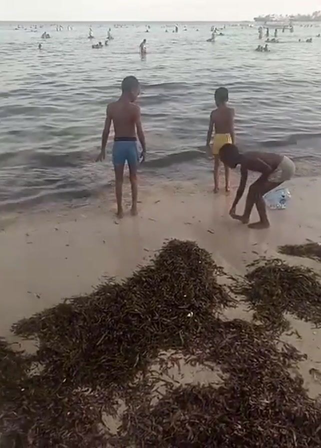 Three young boys are standing on a sandy beach near the water's edge. Two of the boys are standing while the third is bent over picking through seaweed. The boy on the left is wearing blue swim trunks, and the boy in the middle is wearing light-colored swim trunks. The boy who is bent over is wearing light-colored swim trunks and is next to a clear plastic bottle. A large patch of dark seaweed sits in the foreground. In the background, the ocean is visible, with many people swimming and standing in the water. The sky is overcast. A woman in a dress walks past the boys.