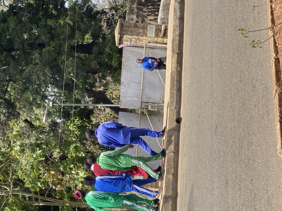 The image depicts an outdoor street scene in Bukuru, Nigeria, under clear daylight conditions. Five individuals are walking from left to right on a paved sidewalk, parallel to a grey asphalt road in the foreground. Their backs are primarily towards the viewer. The leftmost individual wears a green tracksuit with white stripes and red and white headwear. The second and fifth individuals wear blue tracksuits with white stripes. The third individual wears a red tracksuit. The fourth individual wears a green tracksuit with white stripes. On the right side of the sidewalk, a single male individual is positioned in a bent or kneeling posture, facing generally left. He wears a blue t-shirt with partially visible white text and dark trousers or shorts, holding a small, dark object in his hands. The background features dense green foliage and trees, a light-colored metal gate, and a stone wall with pillars. A lamppost is visible above the gate. A concrete curb with a small circular drainage opening separates the sidewalk from the road.