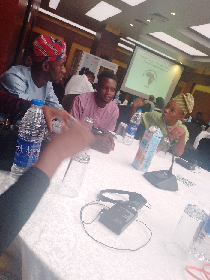 The scene depicts an indoor conference or event occurring in Itirin, Nigeria, specifically within a well-lit room featuring dark wooden paneling and a large projection screen. Four individuals are seated at a white, patterned tablecloth-covered table. On the left, a man wearing a light blue traditional tunic and a red and blue striped cap looks towards the right, his left hand resting near an Aquafina water bottle. Next to him, a man in a light purple traditional tunic faces forward, observing the discussion with his hands clasped on the table. To their right, a man in a light green traditional tunic and a matching striped cap actively speaks, gesturing with his raised right index finger towards an unseen point, while leaning towards a black desktop microphone positioned in front of him. A fourth person's arm, dressed in a black long-sleeved garment, is visible in the foreground. The table is furnished with multiple clear plastic bottles of Aquafina water, several empty clear drinking glasses (some upright, some inverted), and a light blue Chivita 100% juice carton. A black audio receiver device with connected headphones lies on the tablecloth. A black handbag is partially visible to the left. In the background, a large screen displays a presentation slide titled "Unlocking affordable air travel Through the lens of Single African Transport Market (SAATM)", featuring the "AFRICAN YOUTH INITIATIVE (AYCI)" and "(ATC)" logos. Blurred figures of other attendees are visible in the deeper background, seated at similar tables, indicating a larger gathering.