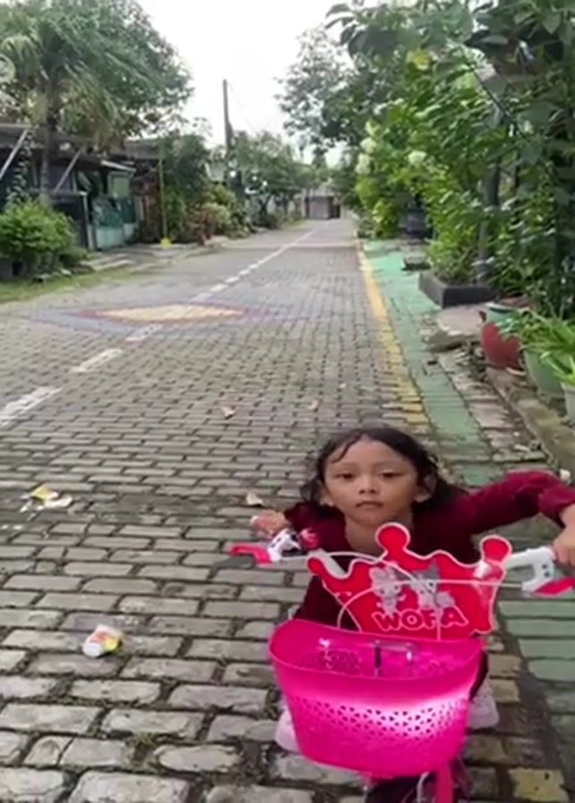 The video opens with a young girl standing with a pink bicycle on a brick road. She is wearing a maroon shirt and pants. The bike has a basket in the front with a decoration that says "MOFA" on it. The camera pans to the left to show the brick road lined with buildings and greenery. In the next shot, a girl in a pink pajama set is seen riding a pink bicycle, while another girl in a yellow outfit stands next to her. They are in front of a house with a dark gate. The girl on the bike is talking to the other girl.