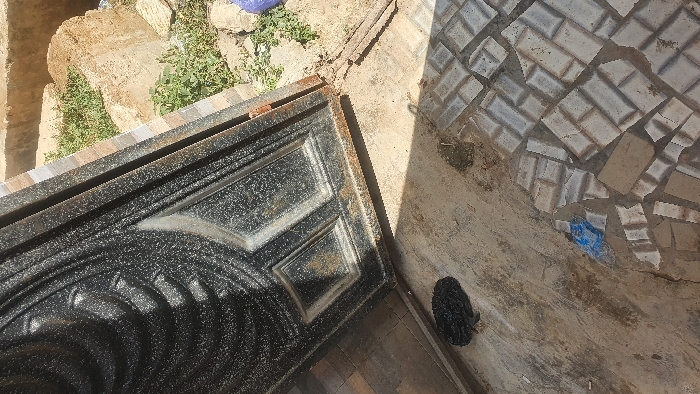 An outdoor scene in Danbare, Nigeria, depicts a large, dark-colored metal gate positioned vertically and angled slightly from top-left to bottom-right. The gate features a textured, speckled surface with an undulating design on its upper section and raised rectangular panels on its lower portion, exhibiting visible rust along its bottom edge. To the immediate right of the gate, exposed soil with sporadic green weeds and light-brown concrete debris or rocks is visible. The foreground transitions from an uneven, dirty concrete patch beneath the gate to a section of light-colored brick paving, some of which is broken, laid in a pattern. A dark, irregular object rests on the concrete near the gate's bottom-left, and a partially visible blue plastic bag is present near the fragmented paving. Sunlight casts distinct shadows across the ground. No individuals are present.