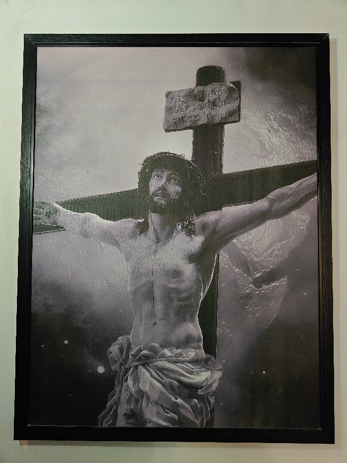 A monochrome framed print, measuring approximately 2.5 feet high, is mounted on a plain, light-colored wall. The print depicts Jesus Christ crucified on a dark wooden cross. Christ is shown from the waist up, with a crown of thorns on his head, long dark hair, and a beard. His head is tilted slightly upwards, and his eyes are open, gazing skyward. His bare, muscular torso appears gaunt, with prominent ribs and abdominal definition; faint dark trickles are visible on his chest and abdomen. His arms are outstretched and secured to the horizontal beam of the cross. A draped loincloth, secured by a visible rope, covers his lower body. Above his head, a plaque is affixed to the vertical beam of the cross, displaying text in Latin: "IESVS NAZARENVS REX IVDAEORVM" (Jesus of Nazareth King of the Jews), with additional, less legible script below. The background is dark and atmospheric, featuring swirling, cloudy textures and scattered small specks of light, suggesting a somber or cosmic environment. The image itself provides no discernible visual information regarding its specific location within the city of Kochi, India.