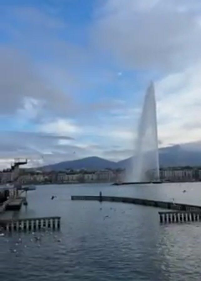 view of Lake Geneva, Switzerland, on a partly cloudy day. The Jet d'Eau, a large fountain, is prominent in the lake. In the foreground, there is a dock-like structure. Many seagulls are flying around the area and perched on the dock. The camera pans to the left to reveal a pier with a diving platform. People are sitting on the pier near a white building. The city of Geneva is visible in the background, with mountains behind it partially obscured by clouds.
