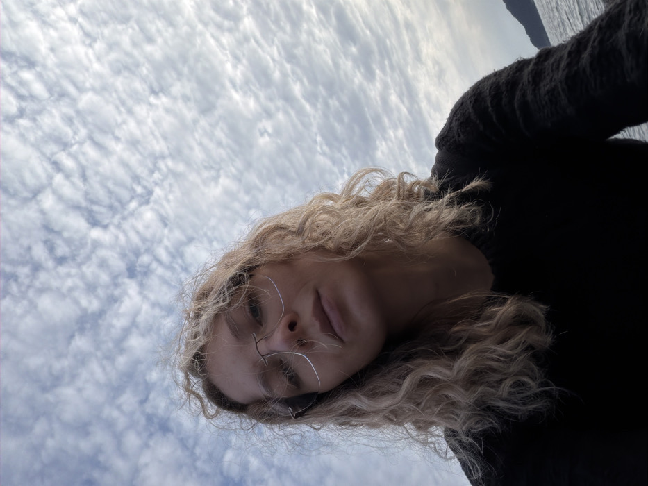 A low-angle, close-up photograph taken in Rafailovići, Montenegro, features a single female subject positioned in the foreground, occupying approximately the lower two-thirds of the frame. The subject has light-colored, curly hair and is wearing frameless eyeglasses. She exhibits a neutral facial expression, looking directly towards the camera. Her attire consists of a dark, textured, long-sleeved garment. The upper portion of the image displays a sky filled with numerous small, scattered altocumulus clouds. In the background, to the subject's right, a body of water is visible, with a dark, elevated landmass (consistent with a coastal hill or mountain) discernible across the water.
