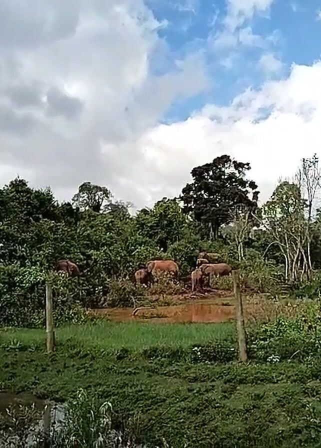 group of elephants gathered on a muddy patch of ground, framed by lush green vegetation and trees. The sky above is partly cloudy with patches of blue. A simple wooden fence line is visible in the foreground, separating the viewer from the area where the elephants are. The elephants appear to be foraging or interacting with the mud. The environment suggests a natural habitat or a protected area for elephants.