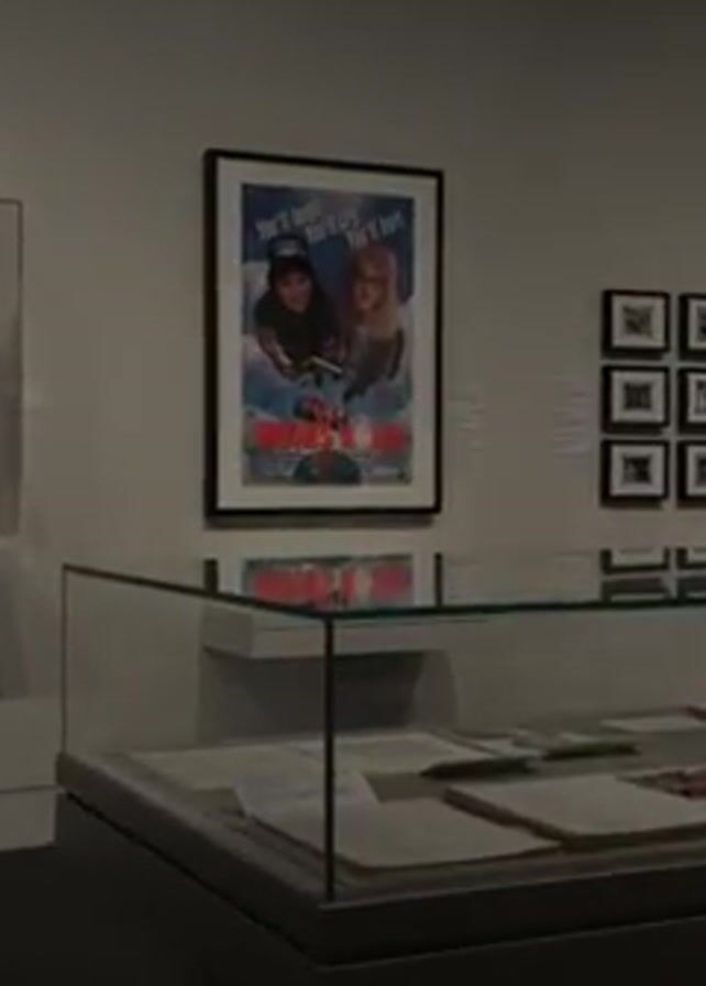 The video presents a static shot of a museum exhibit. In the foreground, there is a glass display case filled with papers and documents. Behind the display, a framed movie poster hangs on the wall. The poster is for the film "Wayne's World," and it features the two main characters in a comedic pose. Above them, the tagline "You'll laugh. You'll cry. You'll hurl!" is visible. To the left of the poster, a garment in a display case is partly visible. To the right, a series of black and white framed photographs are arranged on the wall. The wall is painted in a neutral color, and the lighting in the room is subdued. The overall setting suggests a display of movie memorabilia or a pop culture exhibit.