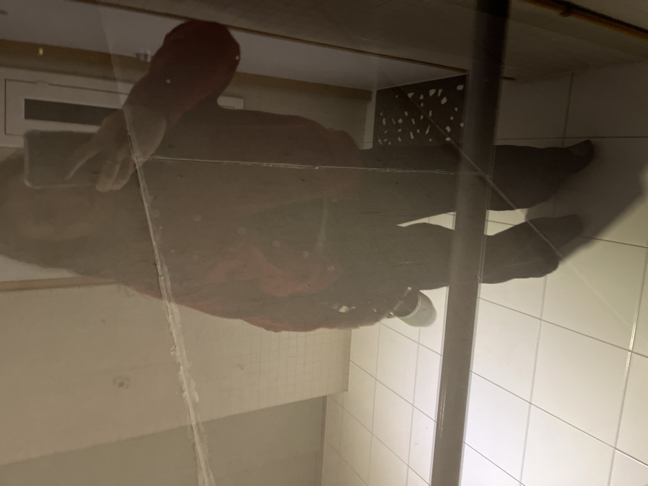 An obscured individual captures a mirror selfie in an interior location within Mexico City, Mexico. The subject, reflected in a large, scratched mirror, wears a red-orange top over dark pants, and holds a smartphone in their right hand, obscuring their face. Their left hand holds a silver, cylindrical object. The environment features a white tiled floor in the foreground and left, transitioning to a dark, speckled mat on the floor to the right. White subway tiles are visible on a wall section to the left, and a light-colored doorframe is present on the right. The scene is dimly lit.