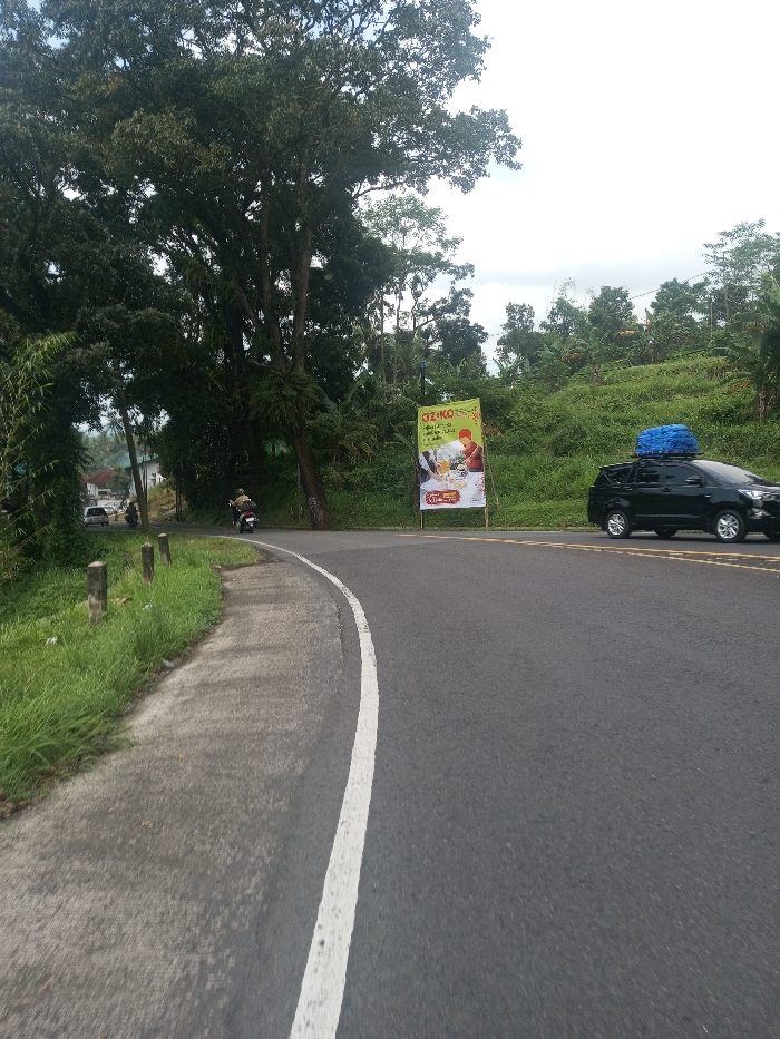 This image depicts a two-lane asphalt road curving gently to the right, observed under an overcast sky in the city of Niz Lakuk, India. The left edge of the road is delineated by a solid white line, adjacent to a grey concrete path bordered by green grass and three light-colored wooden posts. A large, dark-leaved tree with ferns on its trunk dominates the left midground, with additional dense green foliage and distant structures visible behind it. A person wearing a light-colored helmet and dark jacket is riding a scooter away from the viewer on the left lane, with a white vehicle partially visible further down the road. The road's center is marked by double yellow lines. On the right lane, a black SUV with a blue tarp-covered item secured to its roof rack is traveling from right to left across the frame. To the right of the road, a yellow banner-style advertisement sign, supported by poles, features an animated figure in a red cap and green shirt serving food, with the text "OZIKO" at the top. The background consists of a vegetated embankment and dense green trees.