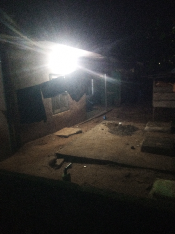 A dimly lit outdoor scene shows a building with clothes hanging outside a window. A bright light source obscures details. In the foreground, there's a concrete area with a water tap and some debris. Beyond the concrete, a dirt patch is visible, and to the right, a structure with shelves stands in the shadows. The overall atmosphere suggests a backyard or courtyard at night, illuminated by a harsh, artificial light.