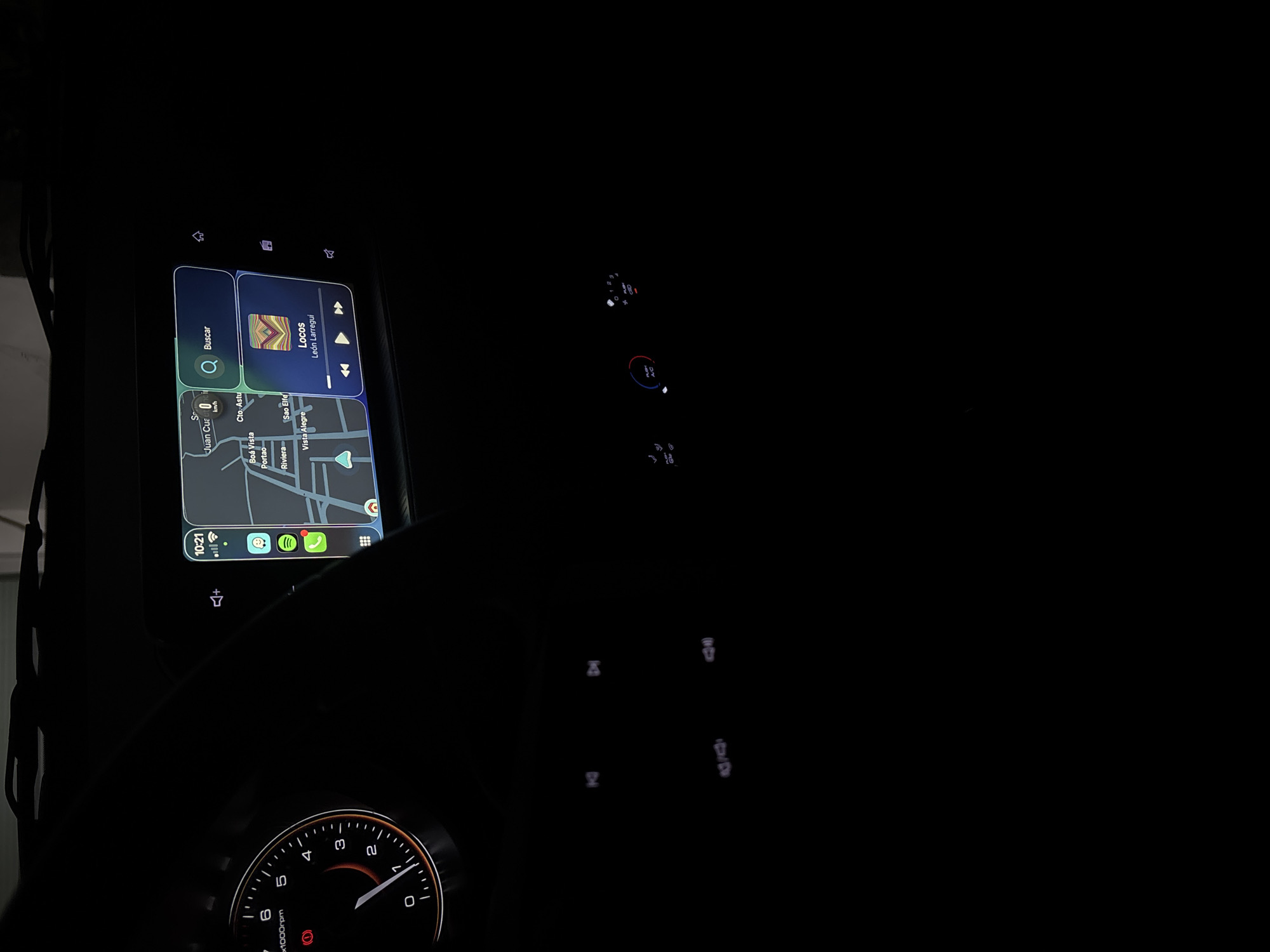 interior of a car at night, with a focus on the infotainment system and the dashboard. The infotainment screen displays a map centered around San Juan Cuautlancingo, Mexico, specifically showing the locations of Boá Vista, Portao, and Riviera. The dashboard includes climate control settings, and the tachometer shows the engine speed is around 0-1000 rpm. The screen indicates the time is 10:21. A song titled "Locos" by León Larregui is playing.