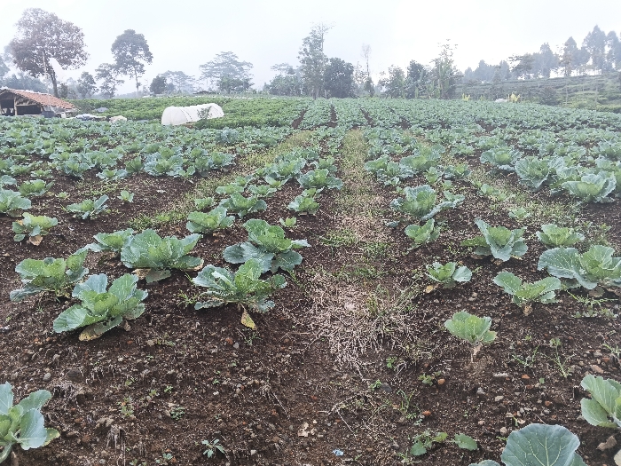 A wide-angle view displays an agricultural field in the city of Siem Reap, Cambodia, under an overcast sky. The foreground and midground feature numerous rows of green, leafy plants, consistent with young cabbage, planted in dark brown tilled earth. Sparse weeds are visible between the cultivated plants. In the upper-left background, a rudimentary wooden structure with a sloped, rusty corrugated metal roof is situated among trees. Further into the mid-background, a white, arched tunnel-like structure, indicative of a small greenhouse or crop cover, is visible within a cultivated area. The far background presents undulating terrain covered with dense green vegetation, including numerous trees and what appear to be terraced crops. No identifiable individuals, animals, or active interactions are depicted in the static scene. The environment appears hazy or misty.