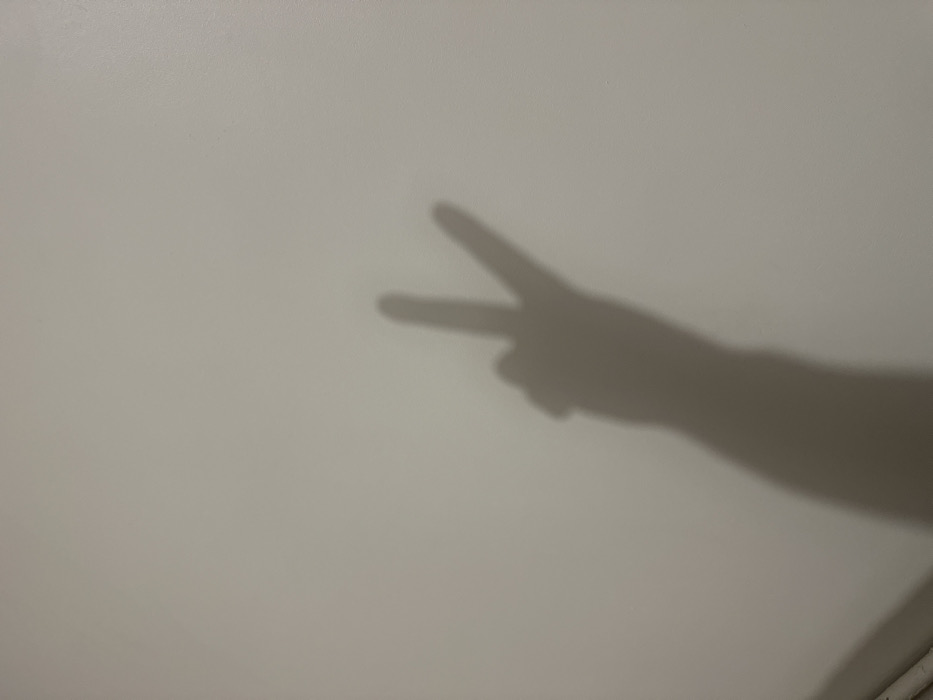 A dark shadow of a human left hand, making a 'V' shape with the index and middle fingers extended upward and apart, is cast upon a uniformly light-toned, possibly off-white or very light gray, plain surface
