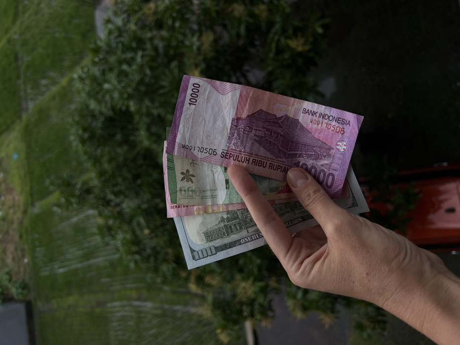 A fair-skinned human hand, visible from the lower forearm, holds three fanned banknotes against a green tropical background. The currency consists of a partial US $100 bill on the left, a partially visible green Indonesian 100,000 Rupiah note (featuring a flower), and a prominently displayed pink/purple Indonesian 10,000 Rupiah note on the right, showing "10000", "SEPULUH RIBU RUPIAH", and a temple structure. The background features lush green foliage and terraced rice paddies further in the distance at the top, indicating an agricultural landscape. A partial view of a red vehicle is present at the bottom left. The image depicts an elevated perspective over a semi-rural environment, consistent with locations in Canggu, Indonesia, under diffused lighting conditions.