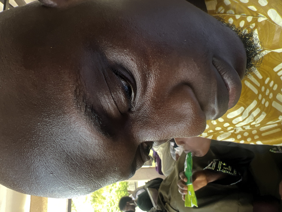 The image depicts a close-up, high-angle view of an individual, likely an adult male, located in Itoga, Nigeria. The primary subject, positioned in the foreground, has dark skin, a shaven head, dark eyebrows, and sparse facial hair under the chin. He wears a yellow garment featuring a repeating light-colored, possibly geometric or abstract, pattern. His eyes are directed downwards and to the left. His skin exhibits some sheen, possibly from sweat or oil, with visible pores and minor wrinkles around the eyes. In the mid-ground, to the left of the primary subject, a second individual is partially visible. This person is seen holding a bright green, flexible packaged item to their mouth, appearing to be drinking from it. They wear a dark, possibly olive green, long-sleeved garment with reflective or embellished detailing on the sleeve near the wrist. Further in the blurred background, other individuals and structural elements are faintly discernible, consistent with an outdoor or open-air setting. Green foliage is visible on the far left, suggesting natural surroundings. The scene indicates a gathering of people.