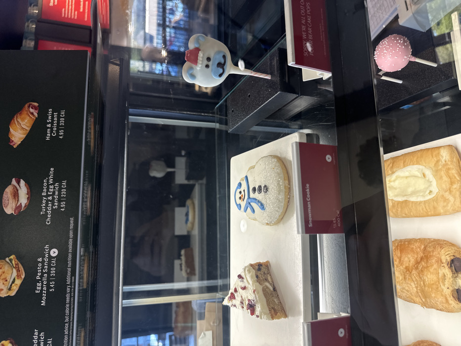 A bakery display case features an assortment of sweets and sandwiches. Visible offerings include: "Egg, Pesto & Mozzarella Sandwich" listed at 5.45 for 390 calories, "Turkey Bacon, Cheddar & Egg White Sandwich" at 4.95 for 230 calories, and a "Ham & Swiss Croissant" priced at 4.95 for 330 calories. Inside the case, there's a "Snowman Cookie" with a tag indicating it's 3.45 and 400 calories. A sign notes they are out of "Polar Bear Cake Pops." A slice of cake and other pastries are also visible.