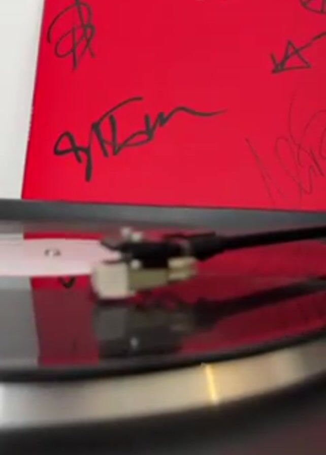 The camera is zoomed in closely on a black vinyl record spinning on a black and silver turntable. The stylus of the turntable is in contact with the record. Behind the turntable, slightly out of focus, is a red album cover with the title "БИ-2" in white and several black autographs. The background is a plain white wall. The lighting is bright and even. The overall focus is on the record playing and the album cover behind it.