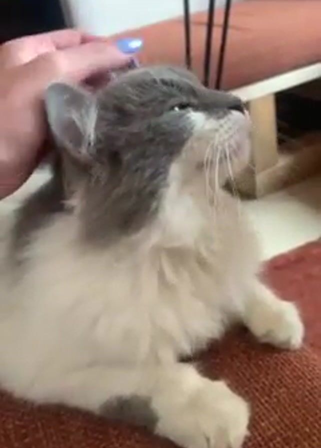 A person with light blue nail polish gently strokes the head of a fluffy, gray and white cat. The cat is lying on a brown upholstered surface, possibly a chair or cushion. The cat appears relaxed, initially looking upwards, then closing its eyes slightly as it is petted. The background includes a wooden table or shelf and the legs of a chair. The overall setting appears to be indoors.