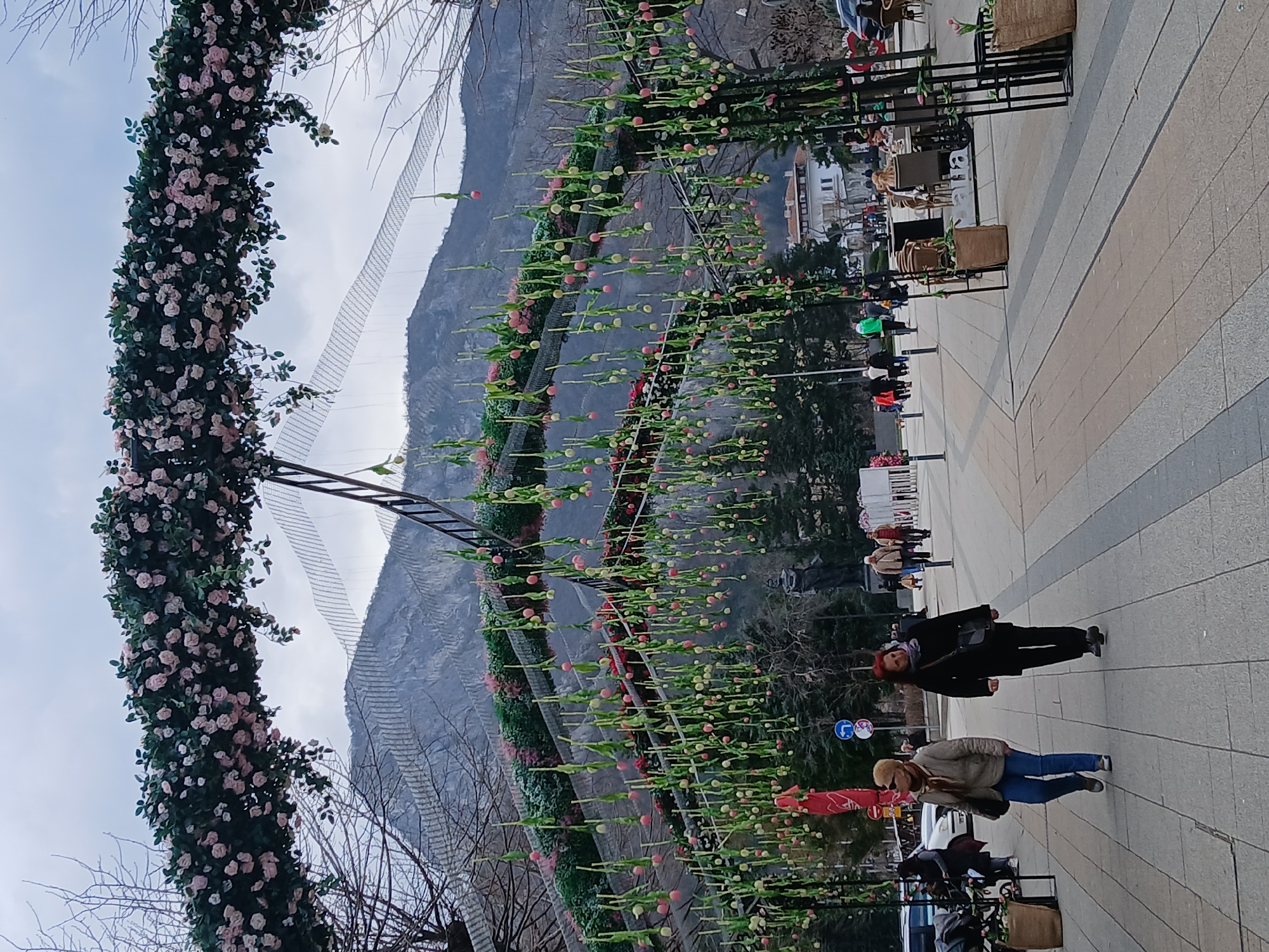 The image captures a pedestrian promenade in Vratsa, Bulgaria, framed by a large, arched metal structure adorned with artificial light pink roses on its upper surface and numerous artificial green-stemmed, pink-tipped tulips suspended below. The Vratsa Balkan mountain range dominates the background under an overcast sky, displaying visible grid patterns on its slopes. The promenade is paved with alternating light and dark grey rectangular tiles. In the immediate foreground, two adult females walk from left to right. The female on the left wears a beige puffer jacket, blue jeans, sunglasses, and carries a dark shoulder bag. The female on the right wears a black coat, black trousers, a dark scarf, and carries a black shoulder bag. Further into the scene, additional pedestrians are visible. On the right, an outdoor cafe area features tables and chairs, occupied by several individuals. Burlap planters are positioned near the cafe and along the decorative structure. In the midground, a dark-colored statue, a blue circular traffic sign indicating a left turn, and bare deciduous trees are present. A white building with a red roof is discernible in the background, partially obscured by trees. Parked vehicles are visible on the periphery of the scene.