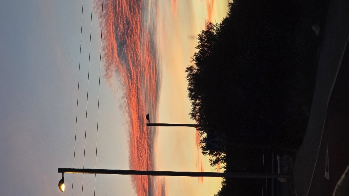 The scene depicts an outdoor environment at dusk in Burjassot, Spain. The upper sky is light blue-grey, transitioning to an orange horizon, with a prominent band of horizontally striated, red-orange clouds extending across the mid-sky. In the foreground on the left, a tall, dark streetlamp is illuminated, emitting a warm yellow light from its fixture. Four dark, thin electrical power lines are visible, spanning horizontally across the sky from left to right. A second, shorter, dark streetlamp with an unlit fixture is positioned to the right of the image center. The lower mid-section of the image is occupied by a dense, dark silhouette of trees or bushes. The ground level in the lower-left quadrant shows a dark asphalt path or road, marked with a curved white line. No individuals or specific activities are observed.