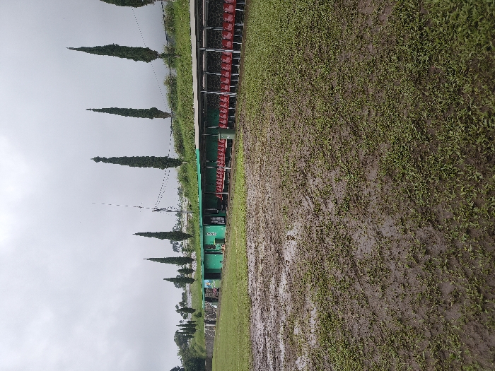 This image displays an outdoor sports facility located in An Khe Ward, Vietnam, under an overcast sky. The foreground consists of a muddy, waterlogged field with numerous patches of standing water and sparse green grass growth. Along the left and middle ground, a series of connected, single-story, green-painted structures, resembling dugouts or changing rooms, are visible. To the right of these structures, an open-sided spectator stand features a long row of empty red plastic seats arranged in multiple tiers beneath a grey roof. A green waste bin is positioned on the muddy ground near the seating area. Behind the structures and stand, an elevated grassy embankment is present, bordered by a distinct line of tall, slender, dark green trees, consistent with cypress trees. A thin metal mast or antenna with wires extends into the grey sky from behind the embankment, between two of the trees. No individuals are visible in the scene.