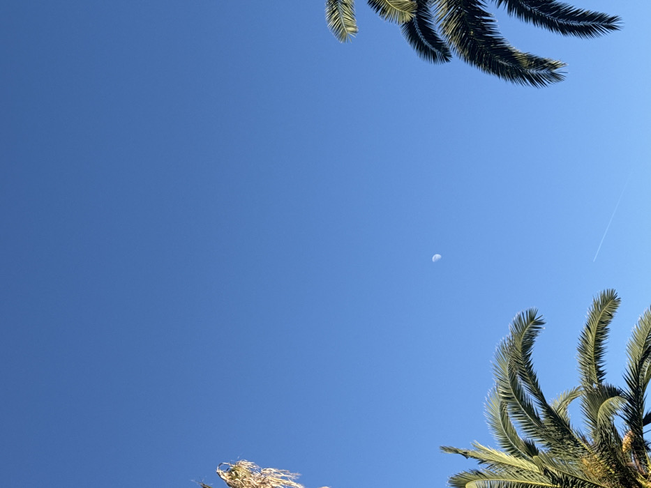 The image depicts an azure blue sky in Budva, Montenegro, under clear daytime conditions. A distinct waxing crescent moon is visible in the upper-middle left quadrant of the sky, illuminated on its right side. A faint, thin white contrail from an aircraft extends diagonally across the lower portion of the sky, from the lower-left towards the mid-right. Two palm trees are partially visible: one occupies the lower-left corner and extends upwards, featuring green fronds interspersed with some drier, lighter-colored foliage at its apex; the second occupies the lower-right corner, displaying dark green fronds extending upwards and to the left. No people or active interactions are visible within the frame.