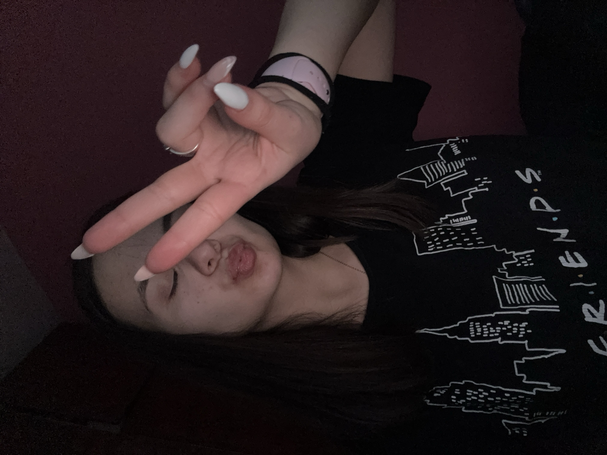 A person is lying down, wearing a black T-shirt with the word "FRIENDS" printed on it in white. The person is making a peace sign with their hand and pouting their lips. They have long dark hair. A ring is on their finger, and a pink wristband is on their wrist. The background is a dark red wall. The location is not Radomir, Bulgaria, based on visual evidence.