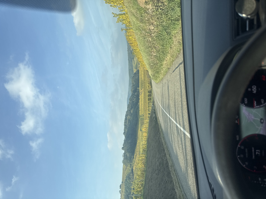 The image depicts a first-person perspective from inside a moving vehicle on a paved road through a vineyard landscape in Blienschwiller, France
