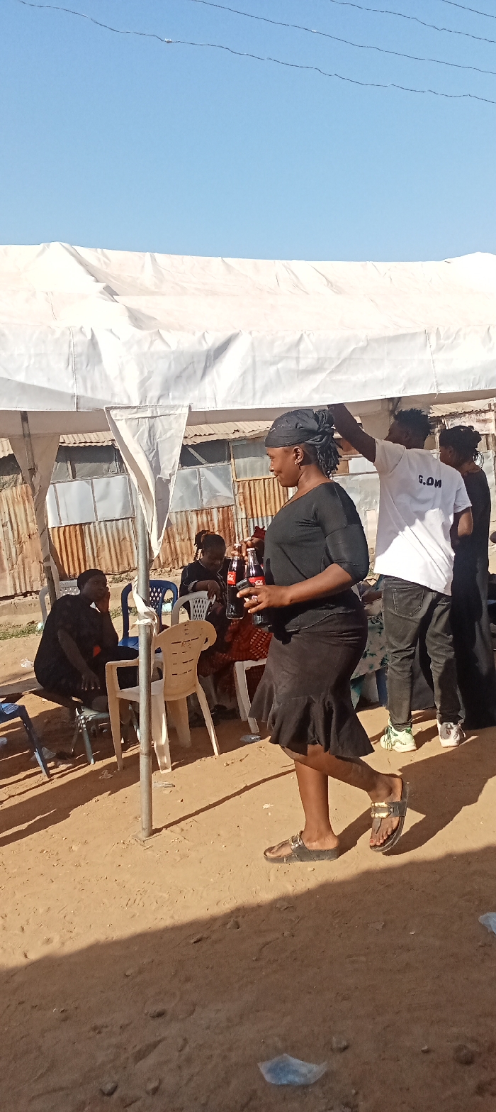 This image depicts an outdoor gathering in Narayi, Nigeria, under a white canopy tent during daylight hours. The ground is composed of dry, reddish-brown earth. In the immediate foreground, a woman wearing a black top, a black ruffled skirt, and dark sandals with gold accents is walking towards the left, carrying two glass bottles of Coca-Cola in her right hand. She has dark hair in braids or dreadlocks, partially covered by a black headwrap, and wears hoop earrings. Under the tent structure, to the woman's right, a man in a white t-shirt with "G.OM" printed on the back stands, extending his right arm upwards towards the tent fabric. Multiple individuals are seated on various plastic chairs (blue, beige, white) around a small table beneath the tent. One person on the far left, dressed in dark clothing, is seated in a blue chair, resting their chin on their hand. Another person in dark attire is partially visible behind a beige chair. The background features structures constructed from corrugated metal sheets, appearing as walls of informal buildings, some with rectangular openings or windows fitted with simple frames. Overhead, power lines are visible against a clear, bright blue sky. Shadows are distinct on the ground, indicating strong sunlight. Minor debris, including a discarded plastic wrapper, is visible on the ground.