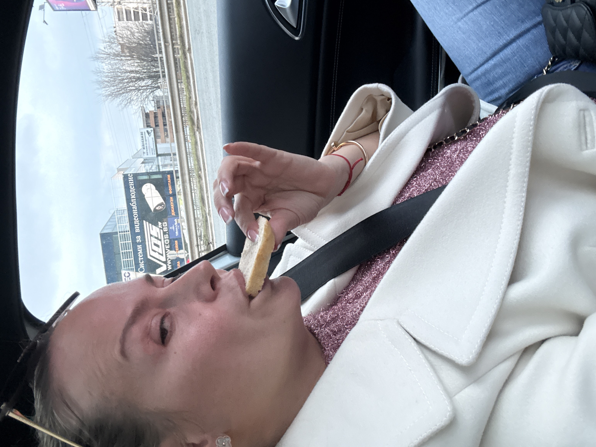 A female individual, appearing middle-aged, is depicted from the chest up, seated in the passenger side of a dark-colored vehicle, looking towards the left. She is actively biting into a piece of light-colored, bread-like food held by her left hand. Her left hand features a French manicure, a thin gold bracelet, and a red string bracelet. She wears a white overcoat, a shimmery pink top, and a black seatbelt across her torso. Sunglasses are perched on her pulled-back hair, and a white, flower-shaped earring is visible on her left earlobe. Blue jeans and a black quilted bag with a gold chain strap are partially visible in the lower right. Through the vehicle's window, an urban street environment is visible under an overcast sky. A multi-lane road is present, separated by a metallic guardrail from the background. Several commercial buildings and leafless trees are discernable. Two large billboards are prominent. One displays Cyrillic text: "Системи за видеонаблюдение" (Video Surveillance Systems), "VDS," "WWW.VEOS.BG," and "ДЖАКУЗИ ФОНТАНИ" (Jacuzzi Fountains). Another billboard advertises "ЕВРОКАМ.BG" (EUROCAM.BG) and "магазин за дронове" (drone shop). Based on these specific Bulgarian advertisements, the scene is located on a major urban thoroughfare within Sofia, Bulgaria.
