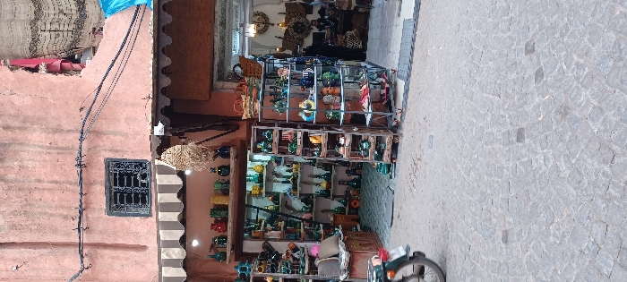 A shop, situated on a cobblestone street, displays an array of artisanal glassware and decorative items on multiple shelving units. The building exterior is a faded pink, adorned with a small, ornate window. Power lines run along the facade. The shop's interior reveals additional ornate wall decorations and lamps. A bicycle is parked just outside the shop.